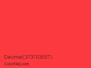 Decimal 373703057 Color is a normal red color and the nearest color is Coral Red #ff4040. Hex code #fb393f and RGB value is rgb(251,57,63). In RGB color space, this color is composed of 98% red, 22% green, 25% blue, In CMYK color space, this color is composed of 0% cyan, 77% magenta, 75% yellow , 2% black , In HSL color space, this color has a hue angle of 358° , 96% saturation and 60% lightness.