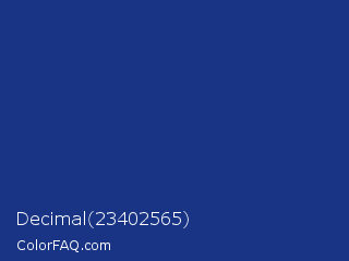 Decimal 23402565 Color is a normal blue color and the nearest color is Bay Of Many #273a81. Hex code #193485 and RGB value is rgb(25,52,133). In RGB color space, this color is composed of 10% red, 20% green, 52% blue, In CMYK color space, this color is composed of 81% cyan, 61% magenta, 0% yellow , 48% black , In HSL color space, this color has a hue angle of 225° , 68% saturation and 31% lightness.