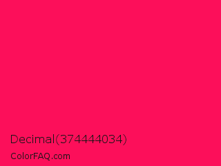 Decimal 374444034 Color is a normal rose color and the nearest color is Folly #ff004f. Hex code #fc0f5a and RGB value is rgb(252,15,90). In RGB color space, this color is composed of 99% red, 6% green, 35% blue, In CMYK color space, this color is composed of 0% cyan, 94% magenta, 64% yellow , 1% black , In HSL color space, this color has a hue angle of 341° , 98% saturation and 52% lightness.