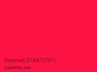 Decimal 374472707 Color is a normal red color and the nearest color is Torch Red #fd0e35. Hex code #fc1343 and RGB value is rgb(252,19,67). In RGB color space, this color is composed of 99% red, 7% green, 26% blue, In CMYK color space, this color is composed of 0% cyan, 92% magenta, 73% yellow , 1% black , In HSL color space, this color has a hue angle of 348° , 97% saturation and 53% lightness.