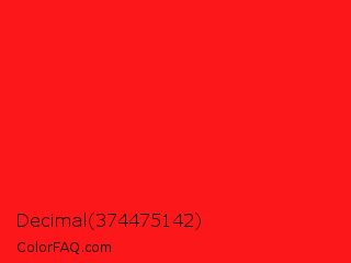 Decimal 374475142 Color is a normal red color and the nearest color is Vivid Red #f70d1a. Hex code #fc171a and RGB value is rgb(252,23,26). In RGB color space, this color is composed of 99% red, 9% green, 10% blue, In CMYK color space, this color is composed of 0% cyan, 91% magenta, 90% yellow , 1% black , In HSL color space, this color has a hue angle of 359° , 97% saturation and 54% lightness.