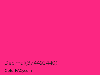 Decimal 374491440 Color is a normal rose color and the nearest color is Fluorescent Pink #ff1493. Hex code #fc2682 and RGB value is rgb(252,38,130). In RGB color space, this color is composed of 99% red, 15% green, 51% blue, In CMYK color space, this color is composed of 0% cyan, 85% magenta, 48% yellow , 1% black , In HSL color space, this color has a hue angle of 334° , 97% saturation and 57% lightness.