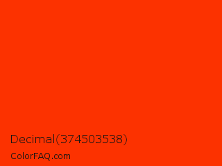 Decimal 374503538 Color is a normal red color and the nearest color is Coquelicot #ff3800. Hex code #fc3200 and RGB value is rgb(252,50,0). In RGB color space, this color is composed of 99% red, 20% green, 0% blue, In CMYK color space, this color is composed of 0% cyan, 80% magenta, 100% yellow , 1% black , In HSL color space, this color has a hue angle of 12° , 100% saturation and 49% lightness.