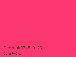 Decimal 374510179 Color is a normal rose color and the nearest color is Neon Fuchsia #fe4164. Hex code #fc376f and RGB value is rgb(252,55,111). In RGB color space, this color is composed of 99% red, 22% green, 44% blue, In CMYK color space, this color is composed of 0% cyan, 78% magenta, 56% yellow , 1% black , In HSL color space, this color has a hue angle of 343° , 97% saturation and 60% lightness.