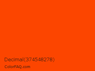 Decimal 374548278 Color is a normal orange color and the nearest color is Orange Red #ff4500. Hex code #fc4500 and RGB value is rgb(252,69,0). In RGB color space, this color is composed of 99% red, 27% green, 0% blue, In CMYK color space, this color is composed of 0% cyan, 73% magenta, 100% yellow , 1% black , In HSL color space, this color has a hue angle of 16° , 100% saturation and 49% lightness.