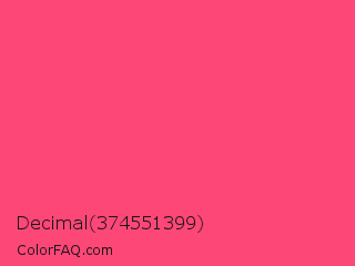 Decimal 374551399 Color is a light rose color and the nearest color is Sasquatch Socks #ff4681. Hex code #fc4777 and RGB value is rgb(252,71,119). In RGB color space, this color is composed of 99% red, 28% green, 47% blue, In CMYK color space, this color is composed of 0% cyan, 72% magenta, 53% yellow , 1% black , In HSL color space, this color has a hue angle of 344° , 97% saturation and 63% lightness.