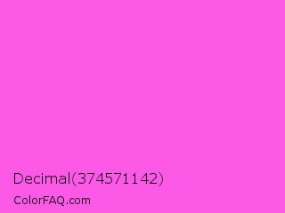 Decimal 374571142 Color is a light magenta color and the nearest color is Purple Pizzazz #fe4eda. Hex code #fc59e6 and RGB value is rgb(252,89,230). In RGB color space, this color is composed of 99% red, 35% green, 90% blue, In CMYK color space, this color is composed of 0% cyan, 65% magenta, 9% yellow , 1% black , In HSL color space, this color has a hue angle of 308° , 96% saturation and 67% lightness.