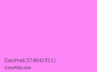 Decimal 374641511 Color is a light magenta color and the nearest color is Light Fuchsia Pink #f984ef. Hex code #fc85f7 and RGB value is rgb(252,133,247). In RGB color space, this color is composed of 99% red, 52% green, 97% blue, In CMYK color space, this color is composed of 0% cyan, 47% magenta, 2% yellow , 1% black , In HSL color space, this color has a hue angle of 303° , 95% saturation and 75% lightness.