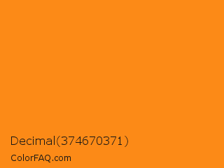 Decimal 374670371 Color is a normal orange color and the nearest color is West Side #ff910f. Hex code #fc8a17 and RGB value is rgb(252,138,23). In RGB color space, this color is composed of 99% red, 54% green, 9% blue, In CMYK color space, this color is composed of 0% cyan, 45% magenta, 91% yellow , 1% black , In HSL color space, this color has a hue angle of 30° , 97% saturation and 54% lightness.