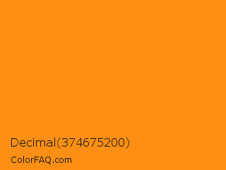 Decimal 374675200 Color is a normal orange color and the nearest color is West Side #ff910f. Hex code #fc8f14 and RGB value is rgb(252,143,20). In RGB color space, this color is composed of 99% red, 56% green, 8% blue, In CMYK color space, this color is composed of 0% cyan, 43% magenta, 92% yellow , 1% black , In HSL color space, this color has a hue angle of 32° , 97% saturation and 53% lightness.