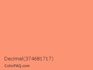 Decimal 374681717 Color is a light red color and the nearest color is Salmon #ff8c69. Hex code #fc9473 and RGB value is rgb(252,148,115). In RGB color space, this color is composed of 99% red, 58% green, 45% blue, In CMYK color space, this color is composed of 0% cyan, 41% magenta, 54% yellow , 1% black , In HSL color space, this color has a hue angle of 14° , 96% saturation and 72% lightness.