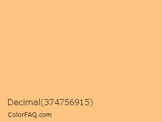 Decimal 374756915 Color is a light orange color and the nearest color is Topaz #ffc87c. Hex code #fcc581 and RGB value is rgb(252,197,129). In RGB color space, this color is composed of 99% red, 77% green, 51% blue, In CMYK color space, this color is composed of 0% cyan, 22% magenta, 49% yellow , 1% black , In HSL color space, this color has a hue angle of 33° , 95% saturation and 75% lightness.