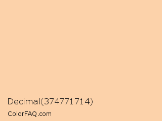 Decimal 374771714 Color is a very light orange color and the nearest color is Deep Champagne #fad6a5. Hex code #fcd2aa and RGB value is rgb(252,210,170). In RGB color space, this color is composed of 99% red, 82% green, 67% blue, In CMYK color space, this color is composed of 0% cyan, 17% magenta, 33% yellow , 1% black , In HSL color space, this color has a hue angle of 29° , 93% saturation and 83% lightness.
