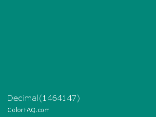 Decimal 1464147 Color is a dark cyan color and the nearest color is Teal Green #00827f. Hex code #028779 and RGB value is rgb(2,135,121). In RGB color space, this color is composed of 1% red, 53% green, 47% blue, In CMYK color space, this color is composed of 99% cyan, 0% magenta, 10% yellow , 47% black , In HSL color space, this color has a hue angle of 174° , 97% saturation and 27% lightness.