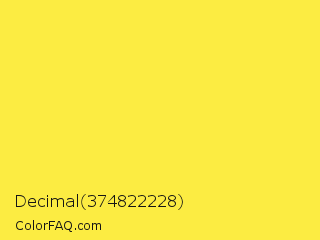 Decimal 374822228 Color is a light yellow color and the nearest color is Gargoyle Gas #ffdf46. Hex code #fcec42 and RGB value is rgb(252,236,66). In RGB color space, this color is composed of 99% red, 93% green, 26% blue, In CMYK color space, this color is composed of 0% cyan, 6% magenta, 74% yellow , 1% black , In HSL color space, this color has a hue angle of 55° , 97% saturation and 62% lightness.