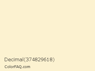 Decimal 374829618 Color is a very light yellow color and the nearest color is Double Pearl Lusta #fcf4d0. Hex code #fcf2d0 and RGB value is rgb(252,242,208). In RGB color space, this color is composed of 99% red, 95% green, 82% blue, In CMYK color space, this color is composed of 0% cyan, 4% magenta, 17% yellow , 1% black , In HSL color space, this color has a hue angle of 46° , 88% saturation and 90% lightness.