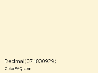 Decimal 374830929 Color is a very light yellow color and the nearest color is Bleach White #fef3d8. Hex code #fcf4d7 and RGB value is rgb(252,244,215). In RGB color space, this color is composed of 99% red, 96% green, 84% blue, In CMYK color space, this color is composed of 0% cyan, 3% magenta, 15% yellow , 1% black , In HSL color space, this color has a hue angle of 47° , 86% saturation and 92% lightness.