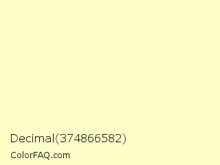 Decimal 374866582 Color is a very light yellow color and the nearest color is Lemon Chiffon #fffacd. Hex code #fcfec8 and RGB value is rgb(252,254,200). In RGB color space, this color is composed of 99% red, 100% green, 78% blue, In CMYK color space, this color is composed of 1% cyan, 0% magenta, 21% yellow , 0% black , In HSL color space, this color has a hue angle of 62° , 96% saturation and 89% lightness.