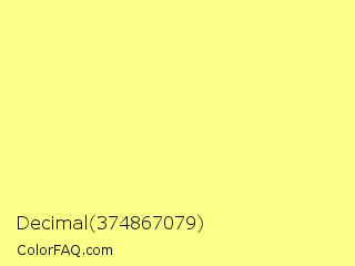 Decimal 374867079 Color is a light yellow color and the nearest color is Dolly #f9ff8b. Hex code #fcff87 and RGB value is rgb(252,255,135). In RGB color space, this color is composed of 99% red, 100% green, 53% blue, In CMYK color space, this color is composed of 1% cyan, 0% magenta, 47% yellow , 0% black , In HSL color space, this color has a hue angle of 62° , 100% saturation and 76% lightness.