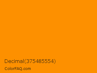 Decimal 375485554 Color is a normal orange color and the nearest color is Pizazz #ff9000. Hex code #fd9000 and RGB value is rgb(253,144,0). In RGB color space, this color is composed of 99% red, 56% green, 0% blue, In CMYK color space, this color is composed of 0% cyan, 43% magenta, 100% yellow , 1% black , In HSL color space, this color has a hue angle of 34° , 100% saturation and 50% lightness.