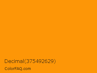 Decimal 375492629 Color is a normal orange color and the nearest color is Orange RYB #fb9902. Hex code #fd9607 and RGB value is rgb(253,150,7). In RGB color space, this color is composed of 99% red, 59% green, 3% blue, In CMYK color space, this color is composed of 0% cyan, 41% magenta, 97% yellow , 1% black , In HSL color space, this color has a hue angle of 35° , 98% saturation and 51% lightness.