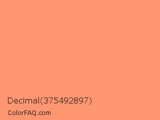 Decimal 375492897 Color is a light orange color and the nearest color is Atomic Tangerine #ff9966. Hex code #fd9671 and RGB value is rgb(253,150,113). In RGB color space, this color is composed of 99% red, 59% green, 44% blue, In CMYK color space, this color is composed of 0% cyan, 41% magenta, 55% yellow , 1% black , In HSL color space, this color has a hue angle of 16° , 97% saturation and 72% lightness.
