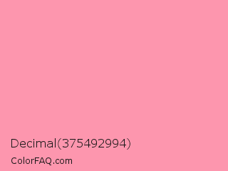 Decimal 375492994 Color is a light red color and the nearest color is Schauss Pink #ff91af. Hex code #fd96ae and RGB value is rgb(253,150,174). In RGB color space, this color is composed of 99% red, 59% green, 68% blue, In CMYK color space, this color is composed of 0% cyan, 41% magenta, 31% yellow , 1% black , In HSL color space, this color has a hue angle of 346° , 96% saturation and 79% lightness.
