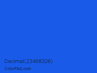 Decimal 23468328 Color is a normal blue color and the nearest color is Bright Navy Blue #1974d2. Hex code #195be8 and RGB value is rgb(25,91,232). In RGB color space, this color is composed of 10% red, 36% green, 91% blue, In CMYK color space, this color is composed of 89% cyan, 61% magenta, 0% yellow , 9% black , In HSL color space, this color has a hue angle of 221° , 82% saturation and 50% lightness.