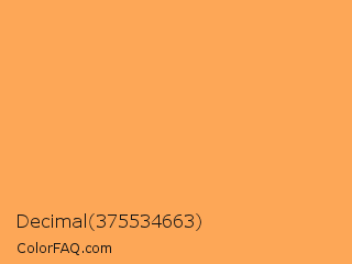 Decimal 375534663 Color is a light orange color and the nearest color is Rajah #fbab60. Hex code #fda757 and RGB value is rgb(253,167,87). In RGB color space, this color is composed of 99% red, 65% green, 34% blue, In CMYK color space, this color is composed of 0% cyan, 34% magenta, 66% yellow , 1% black , In HSL color space, this color has a hue angle of 29° , 98% saturation and 67% lightness.
