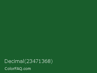 Decimal 23471368 Color is a dark green color and the nearest color is Cal Poly Pomona Green #1e4d2b. Hex code #195e2c and RGB value is rgb(25,94,44). In RGB color space, this color is composed of 10% red, 37% green, 17% blue, In CMYK color space, this color is composed of 73% cyan, 0% magenta, 53% yellow , 63% black , In HSL color space, this color has a hue angle of 137° , 58% saturation and 23% lightness.