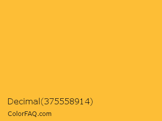 Decimal 375558914 Color is a normal orange color and the nearest color is Saffron #f4c430. Hex code #fdbe36 and RGB value is rgb(253,190,54). In RGB color space, this color is composed of 99% red, 75% green, 21% blue, In CMYK color space, this color is composed of 0% cyan, 25% magenta, 79% yellow , 1% black , In HSL color space, this color has a hue angle of 41° , 98% saturation and 60% lightness.