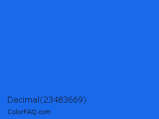 Decimal 23483669 Color is a normal blue color and the nearest color is Blue Crayola #1f75fe. Hex code #1969eb and RGB value is rgb(25,105,235). In RGB color space, this color is composed of 10% red, 41% green, 92% blue, In CMYK color space, this color is composed of 89% cyan, 55% magenta, 0% yellow , 8% black , In HSL color space, this color has a hue angle of 217° , 84% saturation and 51% lightness.
