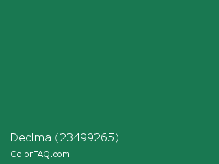 Decimal 23499265 Color is a dark green color and the nearest color is Dark Spring Green #177245. Hex code #197851 and RGB value is rgb(25,120,81). In RGB color space, this color is composed of 10% red, 47% green, 32% blue, In CMYK color space, this color is composed of 79% cyan, 0% magenta, 33% yellow , 53% black , In HSL color space, this color has a hue angle of 155° , 66% saturation and 28% lightness.