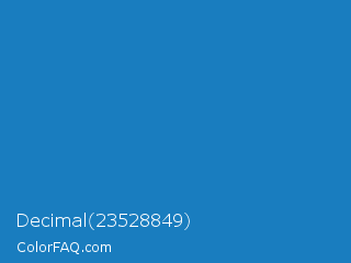 Decimal 23528849 Color is a normal blue color and the nearest color is Cyan Cornflower Blue #188bc2. Hex code #197dbf and RGB value is rgb(25,125,191). In RGB color space, this color is composed of 10% red, 49% green, 75% blue, In CMYK color space, this color is composed of 87% cyan, 35% magenta, 0% yellow , 25% black , In HSL color space, this color has a hue angle of 204° , 77% saturation and 42% lightness.