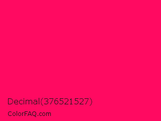 Decimal 376521527 Color is a normal rose color and the nearest color is Vivid Raspberry #ff006c. Hex code #ff0a61 and RGB value is rgb(255,10,97). In RGB color space, this color is composed of 100% red, 4% green, 38% blue, In CMYK color space, this color is composed of 0% cyan, 96% magenta, 62% yellow , 0% black , In HSL color space, this color has a hue angle of 339° , 100% saturation and 52% lightness.