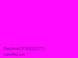 Decimal 376522577 Color is a normal magenta color and the nearest color is Magenta / Fuchsia #ff00ff. Hex code #ff0bff and RGB value is rgb(255,11,255). In RGB color space, this color is composed of 100% red, 4% green, 100% blue, In CMYK color space, this color is composed of 0% cyan, 96% magenta, 0% yellow , 0% black , In HSL color space, this color has a hue angle of 300° , 100% saturation and 52% lightness.