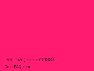 Decimal 376539488 Color is a normal rose color and the nearest color is Vivid Raspberry #ff006c. Hex code #ff1c70 and RGB value is rgb(255,28,112). In RGB color space, this color is composed of 100% red, 11% green, 44% blue, In CMYK color space, this color is composed of 0% cyan, 89% magenta, 56% yellow , 0% black , In HSL color space, this color has a hue angle of 338° , 100% saturation and 55% lightness.