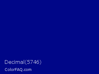 Decimal 5746 Color is a dark blue color and the nearest color is Dark Blue #00008b. Hex code #000688 and RGB value is rgb(0,6,136). In RGB color space, this color is composed of 0% red, 2% green, 53% blue, In CMYK color space, this color is composed of 100% cyan, 96% magenta, 0% yellow , 47% black , In HSL color space, this color has a hue angle of 237° , 100% saturation and 27% lightness.