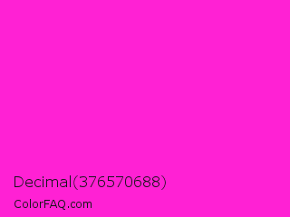 Decimal 376570688 Color is a normal magenta color and the nearest color is Hot Magenta #ff1dce. Hex code #ff21d4 and RGB value is rgb(255,33,212). In RGB color space, this color is composed of 100% red, 13% green, 83% blue, In CMYK color space, this color is composed of 0% cyan, 87% magenta, 17% yellow , 0% black , In HSL color space, this color has a hue angle of 312° , 100% saturation and 56% lightness.