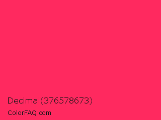 Decimal 376578673 Color is a normal red color and the nearest color is Radical Red #ff355e. Hex code #ff295f and RGB value is rgb(255,41,95). In RGB color space, this color is composed of 100% red, 16% green, 37% blue, In CMYK color space, this color is composed of 0% cyan, 84% magenta, 63% yellow , 0% black , In HSL color space, this color has a hue angle of 345° , 100% saturation and 58% lightness.