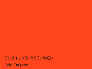 Decimal 376607602 Color is a normal red color and the nearest color is Orioles Orange #fb4f14. Hex code #ff451c and RGB value is rgb(255,69,28). In RGB color space, this color is composed of 100% red, 27% green, 11% blue, In CMYK color space, this color is composed of 0% cyan, 73% magenta, 89% yellow , 0% black , In HSL color space, this color has a hue angle of 11° , 100% saturation and 55% lightness.