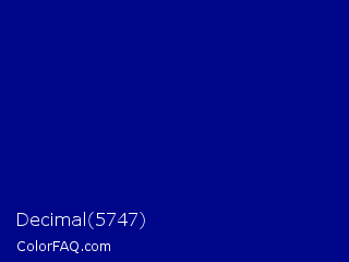 Decimal 5747 Color is a dark blue color and the nearest color is Dark Blue #00008b. Hex code #000689 and RGB value is rgb(0,6,137). In RGB color space, this color is composed of 0% red, 2% green, 54% blue, In CMYK color space, this color is composed of 100% cyan, 96% magenta, 0% yellow , 46% black , In HSL color space, this color has a hue angle of 237° , 100% saturation and 27% lightness.