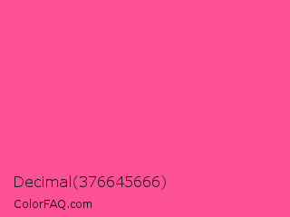 Decimal 376645666 Color is a light rose color and the nearest color is Violet Red #f75394. Hex code #ff5296 and RGB value is rgb(255,82,150). In RGB color space, this color is composed of 100% red, 32% green, 59% blue, In CMYK color space, this color is composed of 0% cyan, 68% magenta, 41% yellow , 0% black , In HSL color space, this color has a hue angle of 336° , 100% saturation and 66% lightness.