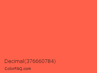 Decimal 376660784 Color is a light red color and the nearest color is Tomato #ff6347. Hex code #ff604a and RGB value is rgb(255,96,74). In RGB color space, this color is composed of 100% red, 38% green, 29% blue, In CMYK color space, this color is composed of 0% cyan, 62% magenta, 71% yellow , 0% black , In HSL color space, this color has a hue angle of 7° , 100% saturation and 65% lightness.