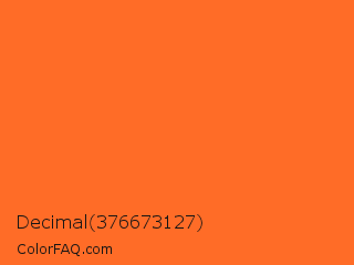 Decimal 376673127 Color is a normal orange color and the nearest color is Orange #ff681f. Hex code #ff6c27 and RGB value is rgb(255,108,39). In RGB color space, this color is composed of 100% red, 42% green, 15% blue, In CMYK color space, this color is composed of 0% cyan, 58% magenta, 85% yellow , 0% black , In HSL color space, this color has a hue angle of 19° , 100% saturation and 58% lightness.