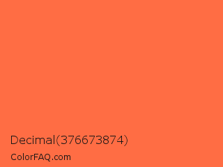 Decimal 376673874 Color is a light red color and the nearest color is Outrageous Orange #ff6e4a. Hex code #ff6d44 and RGB value is rgb(255,109,68). In RGB color space, this color is composed of 100% red, 43% green, 27% blue, In CMYK color space, this color is composed of 0% cyan, 57% magenta, 73% yellow , 0% black , In HSL color space, this color has a hue angle of 13° , 100% saturation and 63% lightness.