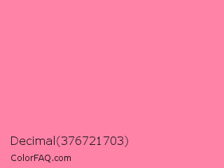 Decimal 376721703 Color is a light rose color and the nearest color is Tickle Me Pink Crayola #fc80a5. Hex code #ff82a7 and RGB value is rgb(255,130,167). In RGB color space, this color is composed of 100% red, 51% green, 65% blue, In CMYK color space, this color is composed of 0% cyan, 49% magenta, 35% yellow , 0% black , In HSL color space, this color has a hue angle of 342° , 100% saturation and 75% lightness.