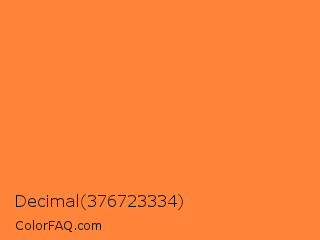 Decimal 376723334 Color is a light orange color and the nearest color is Mango Tango #ff8243. Hex code #ff853a and RGB value is rgb(255,133,58). In RGB color space, this color is composed of 100% red, 52% green, 23% blue, In CMYK color space, this color is composed of 0% cyan, 48% magenta, 77% yellow , 0% black , In HSL color space, this color has a hue angle of 23° , 100% saturation and 61% lightness.