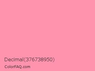 Decimal 376738950 Color is a light red color and the nearest color is Schauss Pink #ff91af. Hex code #ff93ae and RGB value is rgb(255,147,174). In RGB color space, this color is composed of 100% red, 58% green, 68% blue, In CMYK color space, this color is composed of 0% cyan, 42% magenta, 32% yellow , 0% black , In HSL color space, this color has a hue angle of 345° , 100% saturation and 79% lightness.