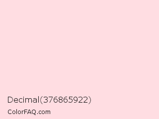Decimal 376865922 Color is a very light red color and the nearest color is Piggy Pink #fddde6. Hex code #ffdde2 and RGB value is rgb(255,221,226). In RGB color space, this color is composed of 100% red, 87% green, 89% blue, In CMYK color space, this color is composed of 0% cyan, 13% magenta, 11% yellow , 0% black , In HSL color space, this color has a hue angle of 351° , 100% saturation and 93% lightness.